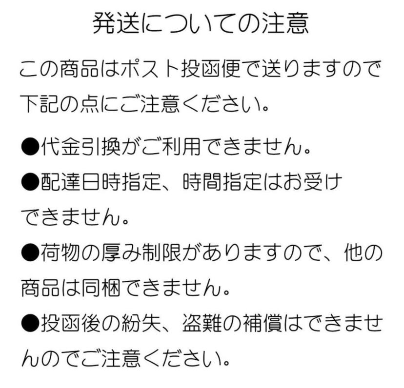 ポスト投函便全国送料無料でお届けします。荷物の厚みを3cmまでに納める為、少し大きめの袋に入れ厚みを抑えます。